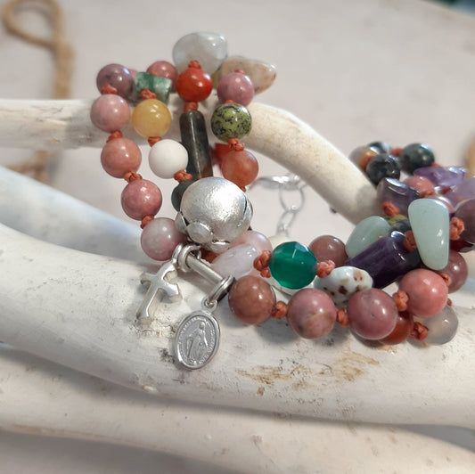 Bracelet Pierres Naturelles - Appeleur d'Anges, Médaille Vierge Miraculeuse et Croix